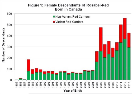 Al final, el equipo de investigación fue capaz de identificar la mutación causal exacto responsable para el gen «dominante roja» en la raza Holstein y confirme su modo de transmisión. Este gen actúa totalmente independiente del gen recesivo rojo tradicional conocida para producir el color rojo de la capa en la raza Holstein. El hecho de que se comporta de una manera dominante sobre el gen responsable de Blanco y Negro color de la capa hace que sea mucho más fácil obtener Rojo y Blanco Holstein, si se desea. Hasta la fecha, todos los animales de edad de cría han sido portadores de una sola copia de este gen «dominante roja», lo que significa que, en promedio, el 50% de su descendencia nacería rojo. Como el interés en este gen aumenta como una fuente de producción de Red & White Holstein, el desarrollo de un portador homocigoto «dominante roja» sería posible y estos animales podría producir una progenie roja 100% del tiempo, sin importar el color del otro padre . Los portadores de «dominante roja» Gene Figura 1 muestra el número de descendientes femeninas de Rosabel-Red en Canadá por año de nacimiento con 2013 sigue siendo incompleta. Los portadores del gen «dominante roja» tradicionalmente han sido etiquetados por Holstein Canadá como * VRC, que significa Variante Red Carrier. Aunque el número de novillas y vacas activas en la población Holstein de Canadá que llevan el gen «dominante roja» es todavía relativamente pequeño, de poco más de 600, ahora hay un enorme potencial para los criadores que se aprovechan de este gen para la producción de Red & White Holstein. Sin ningún tipo de alto rango toros probados que llevan el gen «dominante roja», los criadores pueden utilizar la consulta el sitio web de CDN para encontrar decenas de toros jóvenes que tienen una media de Padre o Genómica Promedio de Padres más de 2500 LPI. En el lado femenino, el más alto de la vaca «dominante roja» supera 2.800 LPI mientras que las novillas de élite han alcanzado la marca de LPI 3000.