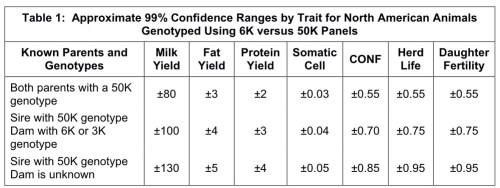El Cuadro 1 presenta un resumen de los rangos de confianza del 99% para los distintos rasgos de importancia, que han sido redondeados para facilitar la comprensión en términos de expresión prueba. Como antes, el padre de los animales tiene un genotipo 50K y su presa tiene o bien un 50K o baja densidad (6K o 3K) genotipo o no lo conozca. En breve, la confianza de 99% varía para cada rasgo muestran claramente que la genotipificación con el panel de 6K es muy precisa en comparación con el uso del panel 50K, y existe la situación óptima cuando los animales tienen ambos padres con un genotipo 50K. En cuanto a LPI, sin embargo, hay algunos escenarios cuando se desea la máxima precisión y se recomienda el panel de 50K. CDN exige que todos los toros entran A.I. para determinar el genotipo con el panel de 50K desde la más alta precisión de su evaluación genómica es importante y estos toros, una vez comprobada la progenie, se convertirá en parte de la población de referencia utilizado en el CDN. Evaluaciones genómicas precisas también son importantes para las madres de toros están siendo consideradas por Amnistía Internacional empresas, así como a cualquier presa de los donantes en la manada para aumentar la precisión de las evaluaciones genómicas para el resultado hijas.