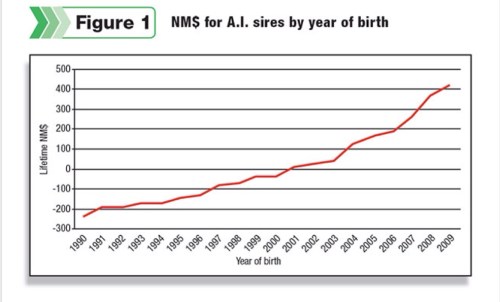 Valores de la Figura 1 se muestra el Mérito Neto Vitalicio (NM $) de AI toros en servicio de su año de nacimiento. Lo que es más notable es que la mejora de NM $ valores de año a año va en aumento.