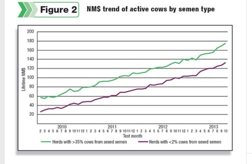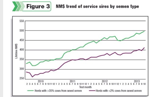 La figura 3 también muestra cómo en los últimos tres años, los valores de $ NM Lifetime para rebaños utilizando semen sexado están aumentando a un ritmo más rápido que las que no utilizarlo.