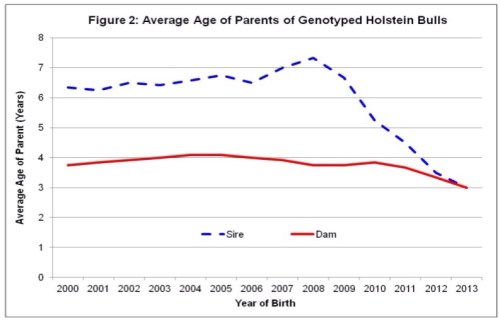 No sólo tiene la genómica permitidos para la preselección de potenciales novillos para la entrada en AI, como se muestra en la Figura 1, pero el aumento de la precisión de las evaluaciones de los toros jóvenes genotipo, vaquillonas y vacas se ha convertido en el foco de las decisiones de selección de los animales más jóvenes. La Figura 2 muestra la evolución de la edad media de los padres de los toros Holstein genotipo por año de nacimiento. Para los toros nacidos antes de 2009, lo que fue antes de las evaluaciones genómicas eran oficial en América del Norte, la edad promedio de los toros está considerando para el ingreso a la IA fue de 6 años, mientras sus madres en promedio alrededor de 4 años de edad. Para genotipo candidatos toros jóvenes nacidos en el año 2013, la edad promedio de su padre llegó a 3 años (es decir: reducción del 55%) y la edad de sus presas reducidas en un 25% a la igualdad también 3 años.