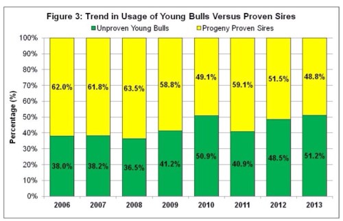 Un resultado clave de la genómica ha sido una atracción esperada por los productores hacia los toros jóvenes genómicos con la correspondiente reducción en el uso de semen de toros probados. Parte de esta atracción se deriva del nivel superior de potencial genético que se ofrecen a los productores interesados en el uso de toros jóvenes genómicos. De hecho, antes de la genómica, la LPI promedio de toros jóvenes entrar AI iba en aumento, en promedio, por 92 puntos por año, que ahora ha aumentado a 160 LPI puntos por año para los toros nacidos desde el año 2009. Antes de la genómica, jóvenes semen de toros ocupan menos del 40% de la cuota de mercado con la progenie toros probados que representan la principal AI producto de interés para los productores. Después de un pico inicial en el uso de toros jóvenes genómicos en 2010, ha habido un aumento continuo interés hacia esta categoría de AI sire, que superó el 51% de la cuota de mercado en 2013 (Figura 3). De hecho, para cada mes desde mayo de 2013, más del 50% de las inseminaciones Holstein en Canadá se han realizado utilizando semen de toros jóvenes genomicos