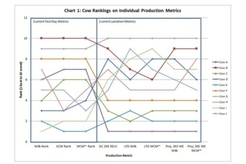 Hacer sacrificios económicos en la producción actual día de la prueba por sí sola puede no ser suficiente en virtud de los cambios actuales del mercado. Variables como la lactancia hasta la fecha (LTD) leche y proyectaron 305-d equivalente maduro (ME) de la leche puede ayudar en el ranking vacas basadas en el rendimiento general de la lactancia. Métricas potenciales como Dairy Comp 305 valor relativo actual (RELV) o PCDart Un regalo para papá Corregido ™ (MCM) también pueden mejorar el ranking de las vacas en el rendimiento general. RELV se basa en ME305 y es un promedio de la manada ME. Así que las vacas de menos de 100 son más bajos que el promedio del rebaño, y los mayores de 100 son más altos que el promedio del hato. MCM ™ es una relativamente nueva métrica para PCDart. La variable es una medida de la productividad de la vaca sobre la base de los valores de mercado (cualquiera de los componentes o de mercado de fluido) y otros valores de comprobación de la leche para un rebaño específica. Esto permite que el valor calculado que se basa en el valor de mercado de la leche, no sólo la energía de la leche.