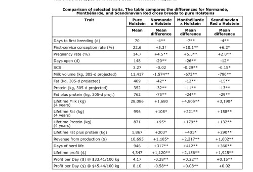 La comparación de los rasgos seleccionados. La tabla compara las diferencias para Normanda, Montbéliarde y escandinavos razas Rojas para los cruces con razas Holstein puras.