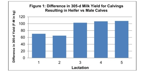 Recomendar a un productor de leche que hay una manera fácil de aumentar la producción de leche por casi 450 kg más de las dos primeras lactancias, y usted tiene su atención! En un artículo científico reciente (véase la referencia más abajo), los investigadores, utilizando los datos de DHI en los Estados Unidos afirmaron precisamente esto. Los autores plantearon la hipótesis de que la producción de leche en la primera lactancia es afectada por el sexo de la cría producida, sino también por el sexo del feto gestado durante ese lactancia. Se predijo también que la capacidad de la ubre para sintetizar la leche a través de todos lactancias está influenciada por el sexo del feto primero, con las hembras siendo ventajosa. Red de Productos Lácteos del Canadá (CDN) realizó un análisis similar utilizando datos de Canadá para ver si los resultados fueron consistentes.