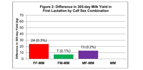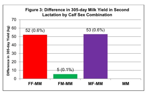 Como se muestra en la Figura 2, la producción de leche en la primera lactancia fue mayor para las vacas que habían dado a luz a una cría hembra y eran entonces embarazada de nuevo en la primera lactancia con otra vaquilla. Las vacas que encajan en esta categoría produjeron 0,3% (24 kg) más leche en su primera lactancia (305 días) que las que dieron a luz a un becerro y estaban embarazadas con otro hombre. Cualquier efecto de llevar a una vaca durante el primer embarazo de la vaca fue esencialmente eliminado cuando el segundo embarazo (es decir: durante la primera lactancia) resultó en un ternero macho (FM-MM). Llevar una ternera durante el primer embarazo lactancia mostró un cierto aumento de la producción de primera lactancia, pero muy pequeña a los 13 kg.