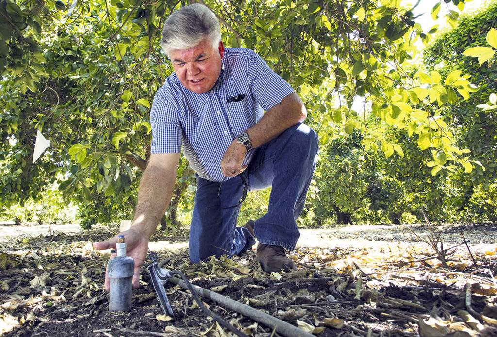 Dan Galbraith muestra la parte superior de un sensor de agua en una plantación de limoneros en Terra Bella, California.