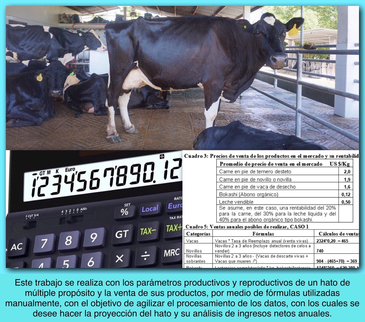Este trabajo se realiza con los parámetros productivos y reproductivos de un hato de múltiple propósito y la venta de sus productos, por medio de fórmulas utilizadas manualmente, con el objetivo de agilizar el procesamiento de los datos, con los cuales se desee hacer la proyección del hato y su análisis de ingresos netos anuales.