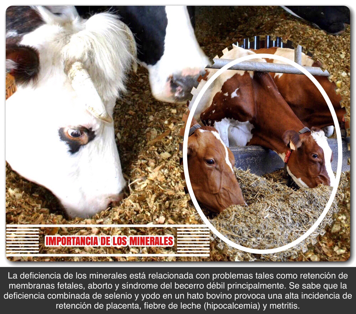 La deficiencia de los minerales está relacionada con problemas tales como retención de membranas fetales, aborto y síndrome del becerro débil principalmente. Se sabe que la deficiencia combinada de selenio y yodo en un hato bovino provoca una alta incidencia de retención de placenta, fiebre de leche (hipocalcemia) y metritis. Se ha informado de diferencias en el rendimiento reproductivo del ganado bovino y ovino cuando se hacen estrategias de suplementación con minerales.