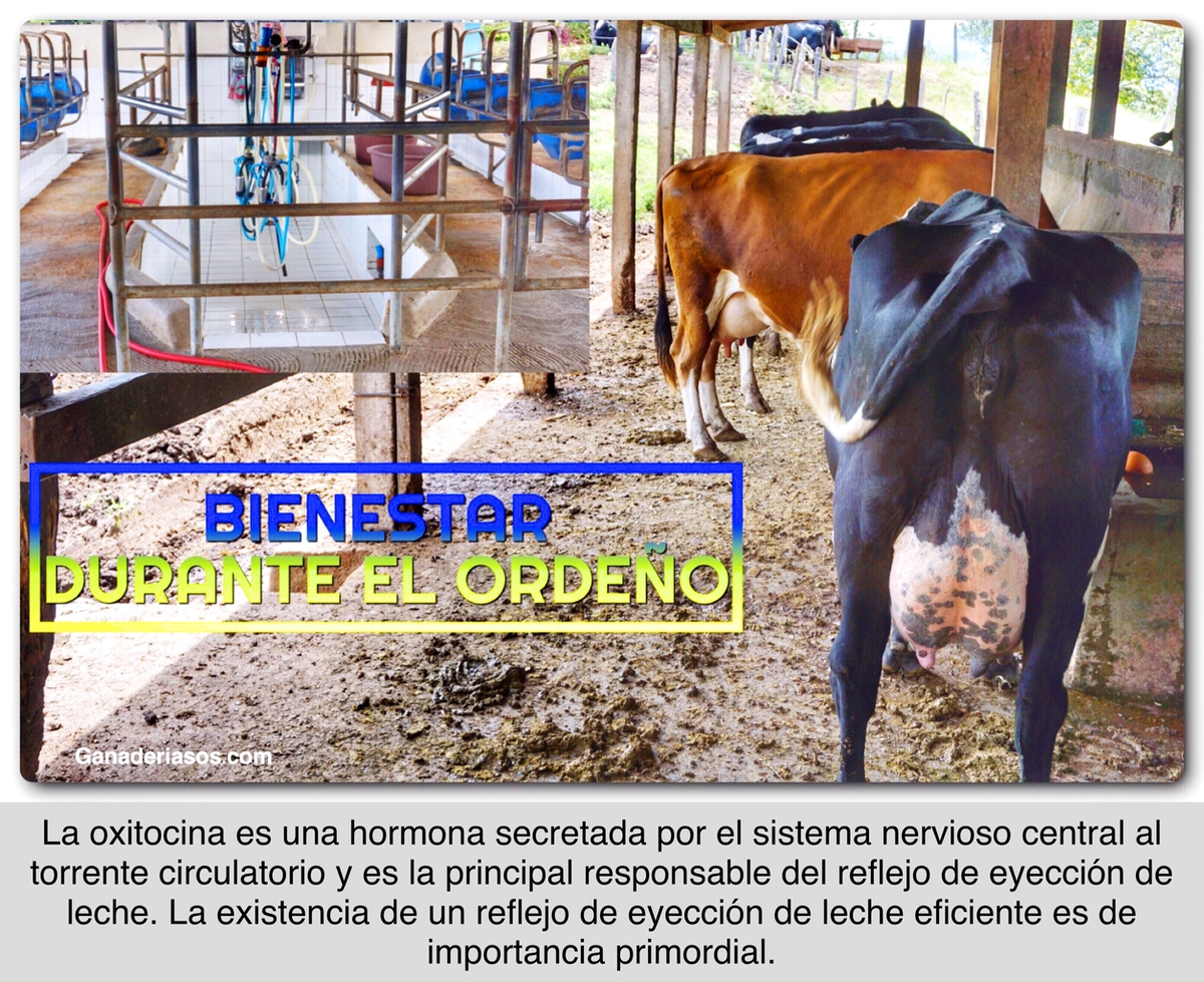 La oxitocina es una hormona secretada por el sistema nervioso central al torrente circulatorio y es la principal responsable del reflejo de eyección de leche. La existencia de un reflejo de eyección de leche eficiente es de importancia primordial. Este reflejo neuroendocrino es necesario para garantizar la expulsión de la leche alveolar y para optimizar la producción de leche. La oxitocina liberada al torrente sanguíneo por estimulación de la hipófisis posterior es la principal responsable de la eyección de leche, al aumentar la presión interna alveolar y reducir la resistencia de los conductos de excreción mamarios. La integración de una serie de estímulos ambientales en el mesencéfalo condiciona la descarga de oxitocina. Cuando estos estímulos ambientales son percibidos para el animal como negativos se desencadena una respuesta de estrés. En consecuencia, se incrementa el tono simpático que reduce la secreción de oxitocina, hay constricción de los vasos mamarios y de las células musculares de los canales galactóforos, y se inhibe la respuesta de las células mioepiteliales a la oxitocina. Además, niveles altos de cortisol y de noradrenalina se asocian a un estrés por el ordeño y a unreflejo de eyección de leche alterado, sobre todo en novillas.