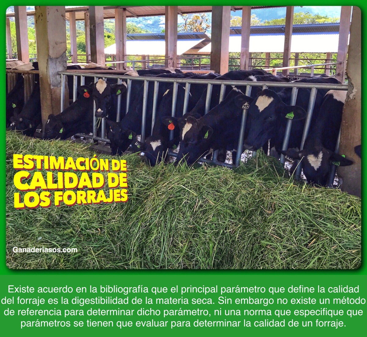 Sin embargo no existe un método de referencia para determinar dicho parámetro, ni una norma que especifique que parámetros se tienen que evaluar para determinar la calidad de un forraje. Tampoco está definida la terminología apropiada para usar en la temática, es así que tanto se puede hablar de calidad de forrajes, calidad forrajera, valor nutritivo, calidad nutritiva, composición nutritiva, o simplemente «calidad», entre otros términos. Algunos autores consideran que la calidad es una propiedad del forraje, otros que es el resultado de la respuesta del forraje al ambiente y/o manejo, y otros consideran que debe incluir la respuesta animal o el consumo. También algunos laboratorios no determinan la digestibilidad in Vitro de la materia seca (DIVMS) y la estiman con una fórmula a partir de la fibra detergente ácida (FDA):