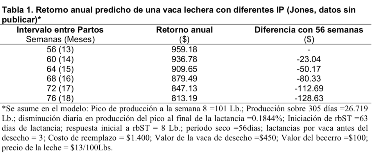 El servir a tiempo las vacas posparto es esencial para reducir los días abiertos y el correspondiente Intervalo entre Partos (IP). Un programa de servicio exitoso mejora la rentabilidad maximizando el tiempo que las vacas están en la parte más productiva de la lactancia. Para optimizar la rentabilidad, tradicionalmente se ha recomendado un IP promedio de 13 meses. La aprobación por la FDA de la somatotropina recombinante bovina (rbST) para vacas en producción, llevó a varios científicos a preguntarse sobre la validez de los cortos IP y a investigar el concepto de los IP extendidos. Sin embargo, un reciente análisis económico indica que sin importar el uso del rbST, extender el IP más allá de 13 meses va en detrimento del ingreso anual por vaca (tabla 1). Por favor note que estos cálculos son basados en modelos, no en datos empíricos y no incluyen el impacto económico asociado de la disminución en la frecuencia de períodos periparturientos en los IP extendidos. Se necesitan más estudios para evaluar adecuadamente la factibilidad y rentabilidad de los IP extendidos.