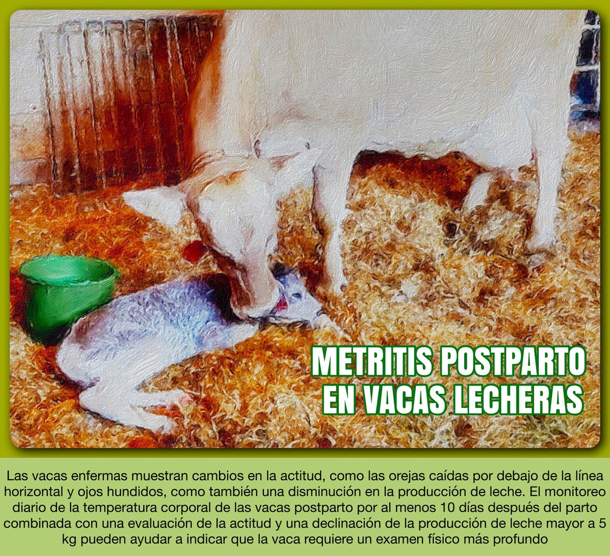 Muchos propietarios o administradores de tambos deben confiar en empleados para identificar y tratar vacas enfermas. Los empleados deben ser entrenados apropiadamente respecto a los signos de las enfermedades del postparto. El aumento de la temperatura corporal asociado con enfermedades postpartales, aunque no sea útil solo, es muy probable que ocurra entre los 3 a 6 días después del parto (25). Las vacas enfermas muestran cambios en la actitud, como las orejas caídas por debajo de la línea horizontal y ojos hundidos, como también una disminución en la producción de leche. El monitoreo diario de la temperatura corporal de las vacas postparto por al menos 10 días después del parto combinada con una evaluación de la actitud y una declinación de la producción de leche mayor a 5 kg pueden ayudar a indicar que la vaca requiere un examen físico más profundo.