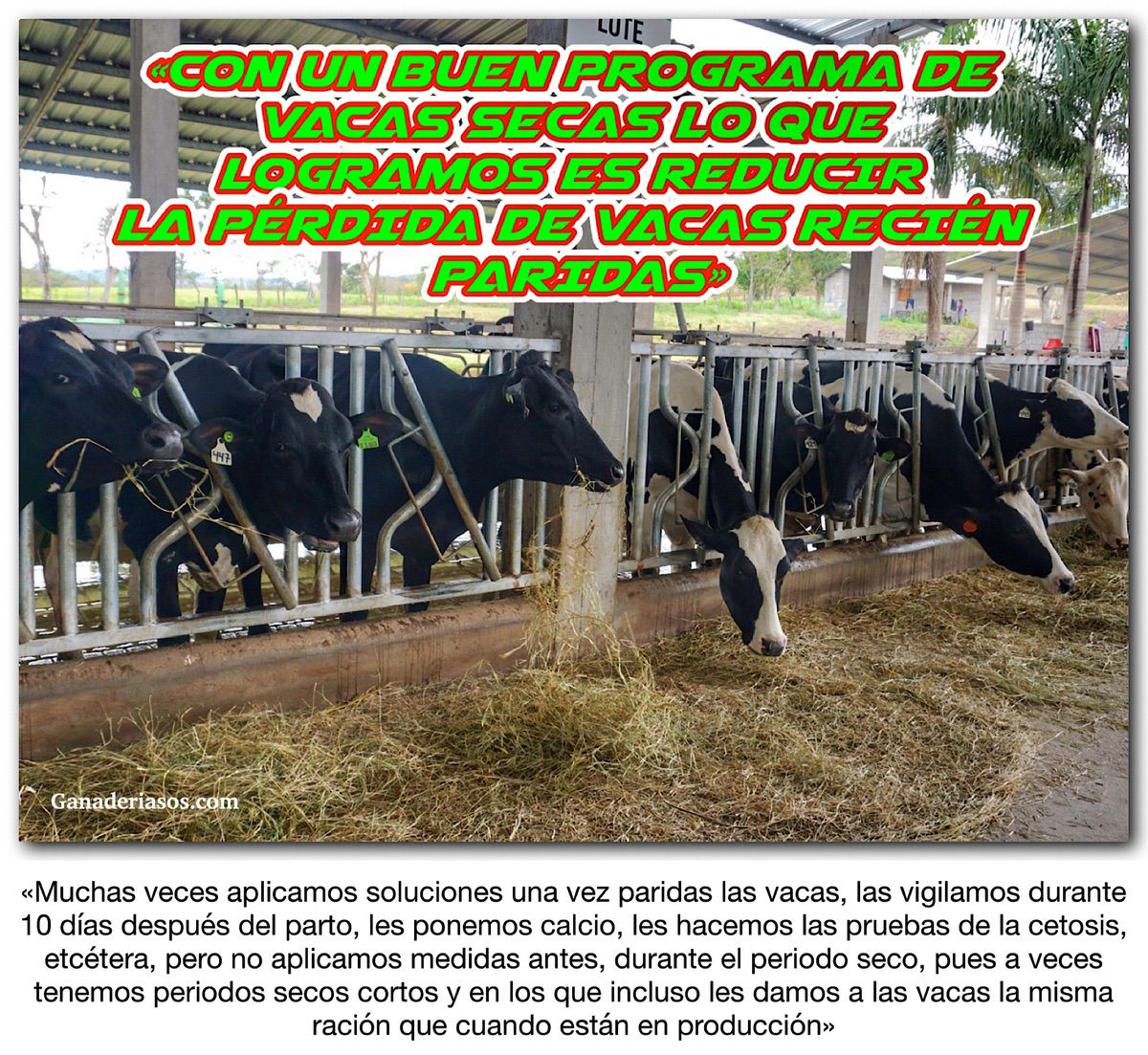 «Muchas veces aplicamos soluciones una vez paridas las vacas, las vigilamos durante 10 días después del parto, les ponemos calcio, les hacemos las pruebas de la cetosis, etcétera, pero no aplicamos medidas antes, durante el periodo seco, pues a veces tenemos periodos secos cortos y en los que incluso les damos a las vacas la misma ración que cuando están en producción», dijo.