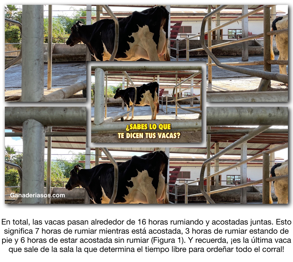 Las vacas lecheras en echaderos freestall pasan de 4 a 6 horas comiendo, consumiendo de 9 a 14 comidas por día. Además, rumian alrededor de 10 horas y requieren aproximadamente de 12 a 14 horas de descanso en 11 episodios de descanso. Eso deja como máximo 3 horas al día para otras conductas, incluidas las actividades de manejo. Ten en cuenta que la rumia y el tiempo de descanso se superponen un poco.