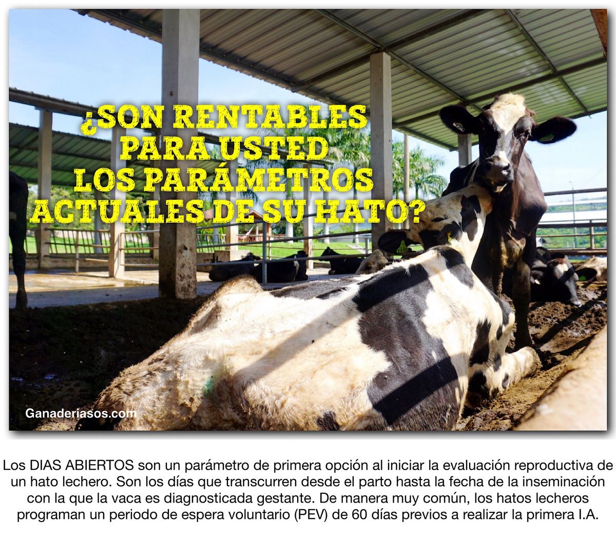 Los DIAS ABIERTOS son un parámetro de primera opción al iniciar la evaluación reproductiva de un hato lechero. Son los días que transcurren desde el parto hasta la fecha de la inseminación con la que la vaca es diagnosticada gestante. De manera muy común, los hatos lecheros programan un periodo de espera voluntario (PEV) de 60 días previos a realizar la primera I.A. De hecho los programas de sincronización del celo se proyectan con tiempo para que las vacas inicien su periodo reproductivo a partir de 60 días. De aquí en adelante, las vacas tendrán por lo menos 5 opciones para quedar gestantes antes de cumplir 150 DÍAS ABIERTOS como lo veremos después. También es importante dejar en claro que el 95% de los animales en riesgo de celo deben tener al menos una Inseminación (I.A.) antes de 100 DÍAS ABIERTOS. Es de insistir entonces en la importancia que tiene la evaluación de estos días, pues además, tienen la particularidad de definir junto con los días de gestación (275) el INTERVALO ENTRE PARTOS futuro (120 DABI + 275 DCC 30.4 = 13 meses).