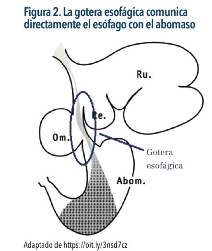 Ig, pero la aportación de calostro mediante métodos artificiales permite controlar la cantidad que se administra y el momento de la primera toma8 . Durante las primeras semanas de vida de los terneros, el reflejo de la acción de mamar estimula la formación de la gotera esofágica, cuya función es comunicar directamente el esófago con el abomaso10 . Por lo tanto, si el becerro mama el calostro, este pasará del esófago al abomaso y de ahí al intestino, como se ve en la figura 2. En cambio, el calostro administrado mediante sonda llega a la rumia antes de pasar al abomaso, lo que supone un lapso de tiempo de 2 a 4 horas al no funcionar la gotera esofágica3 . Aun así, el uso de la sonda en condiciones adecuadas y aportes correctos es un buen método de encalostramiento11 .
