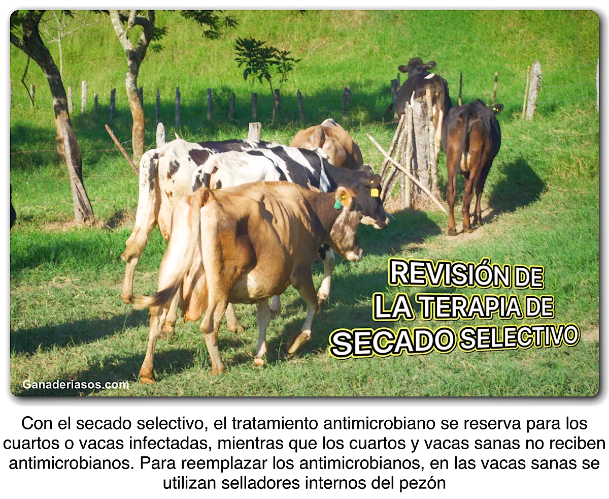 El secado selectivo, redujo el uso de antimicrobianos al secado en un 66%. No hubo diferencias en la eliminación de IIM existentes al secado entre el secado selectivo y total. El riesgo de incidencia de IIM durante el período seco, riesgo de IIM al parto, riesgo de mastitis clínica al inicio de la lactancia y la producción de leche y RCS en la lactancia temprana, no difirió entre el secado selectivo y el secado total, cuando un sellador interno de pezones fue administrado a los cuartos/vacas sanas no tratados con antimicrobianos al secado. En los estudios, donde no se utilizó un sellador interno de pezones, el secado selectivo resultó en un alto riesgo de adquirir nuevas IIM durante el período seco y presencia de IIM al parto.