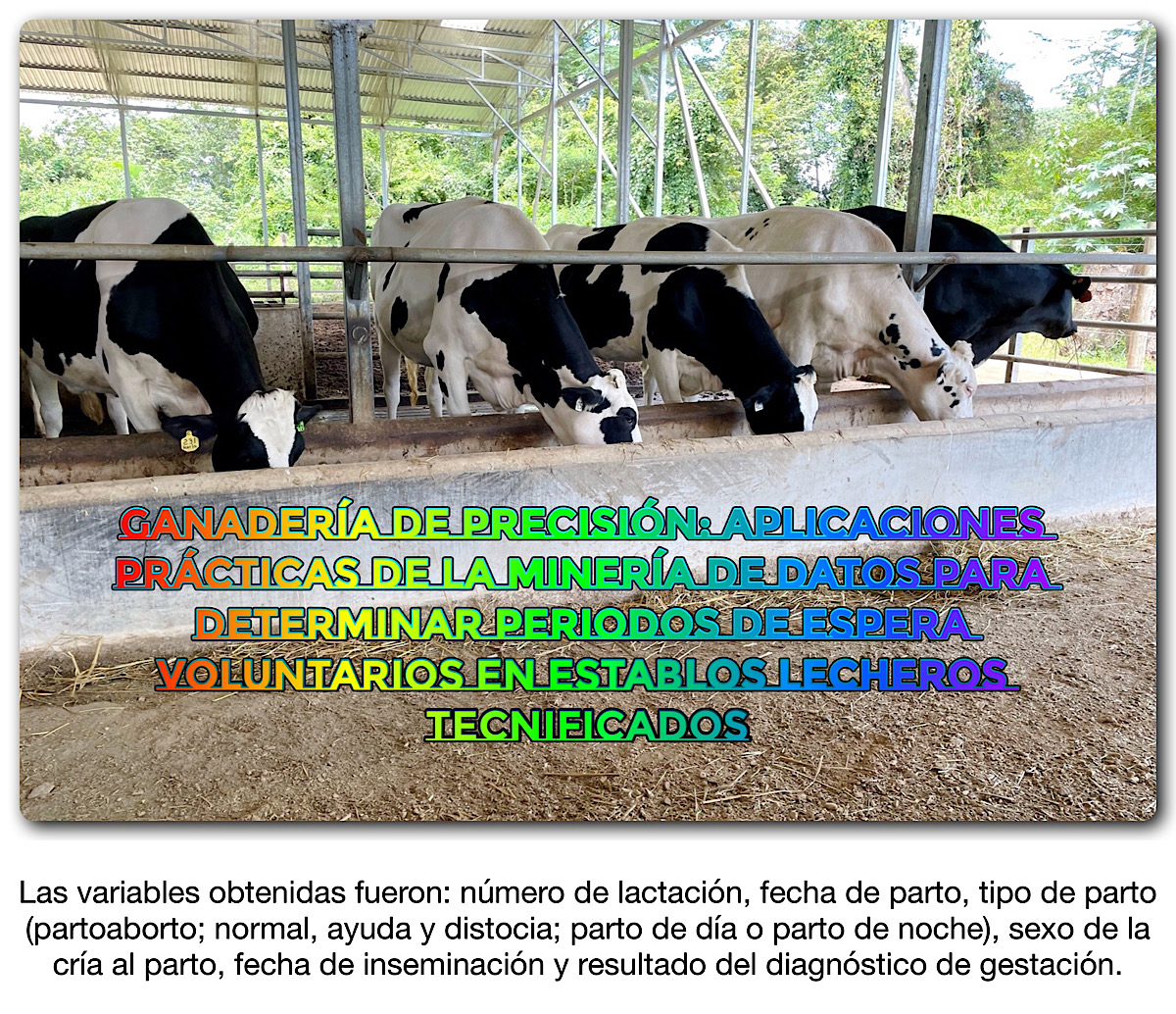 Los establos pertenecientes al sistema tecnificado de producción de leche en México cuentan con un gran número de cabezas de ganado (SADER, 2020). En estas unidades de producción, día a día se registra información productiva y reproductiva la cual es utilizada para obtener indicadores productivos y reproductivos y evaluar el comportamiento a través del tiempo (Núñez et al., 2019). Aunque estos indicadores son útiles, el tipo de análisis que se lleva a cabo se limita a obtener promedios y porcentajes, sin hacer un análisis más profundo de la información generada (Caraviello et al., 2006). Aunado a esto, el análisis científico de la información, a través de la minería de datos, permite encontrar áreas de oportunidad clave, con la finalidad de establecer estrategias de manejo específicas para cada establo, grupo de animales o incluso a nivel individual, es decir, una vía más hacia la ganadería de precisión (Caraviello et al., 2006; Lokhorst et al., 2019). Por otra parte, el desempeño reproductivo y la rentabilidad en los establos lecheros están fuertemente asociados. Esta asociación radica en que conforme transcurren los días en leche, la eficiencia de las vacas para convertir el alimento en leche disminuye (Britt et al., 2003). Por lo tanto, es importante que las vacas queden gestantes nuevamente lo más pronto posible después de un parto. Aunado a esto, el periodo de espera voluntario (PEV) es una herramienta de manejo que se refiere a los días que transcurren desde el parto hasta el día en que las vacas son elegibles para recibir la primera inseminación artificial (Inchaisri et al., 2011; Miller et al., 2007).