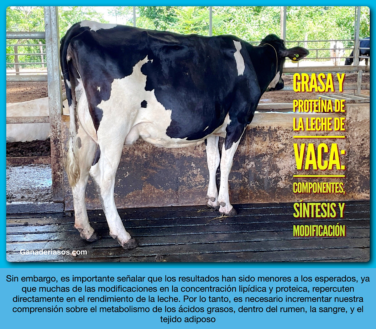 Sin embargo, es importante señalar que los resultados han sido menores a los esperados, ya que muchas de las modificaciones en la concentración lipídica y proteica, repercuten directamente en el rendimiento de la leche. Por lo tanto, es necesario incrementar nuestra comprensión sobre el metabolismo de los ácidos grasos, dentro del rumen, la sangre, y el tejido adiposo (Heid y Keenan, 2005; Kumar et al., 2009; Houten y Wanders, 2010), considerando así mismo tanto el transporte del amoníaco (Deng et al., 2008) como la replicación de la proteína bacteriana (Nam y Garnsworthy, 2007). Este conocimiento, permitiría entender con mayor claridad, los mecanismos involucrados en la formación de sustratos para la síntesis de los glóbulos grasos y las micelas de caseína.