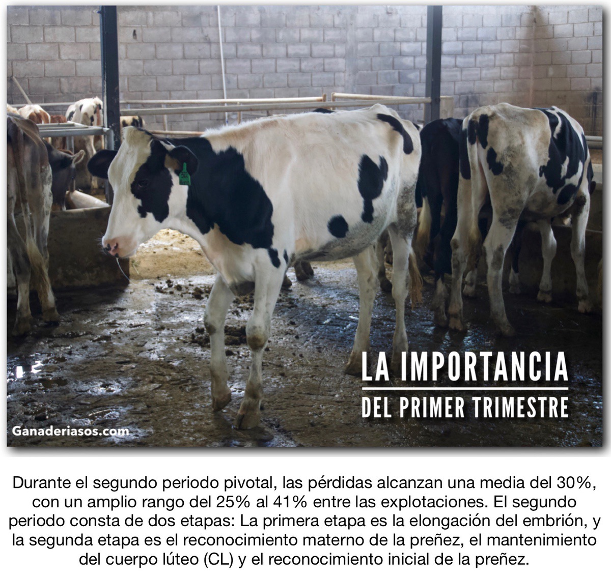 Sin embargo, el primer trimestre es mucho más complicado e importante para conseguir una gestación. Una investigación de la Universidad de Guelph en 2018 informó de que el 83% de los óvulos son realmente fecundados, pero solo el 67% son viables en el sexto día. En este informe, el 39% de los embriones viables no lograron materializarse en un embarazo para el día 28. Aunque las pérdidas son grandes, el resultado es una tasa de concepción respetable del 41%. Sin embargo, un asombroso 51% (más de la mitad) de todos los óvulos fecundados no dan lugar a una preñez. Tenemos que preguntarnos: