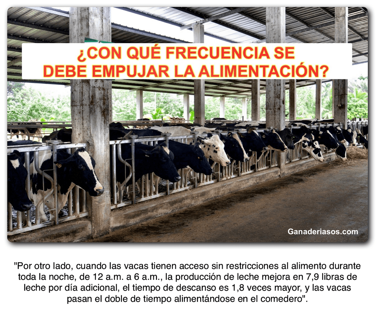 A medida que las vacas comen durante el día, el alimento se aleja más del comedero. Esto hace que sea más difícil para los animales alcanzarlo. Para evitar que esto suceda, se debe empujar el alimento hacia los animales regularmente.