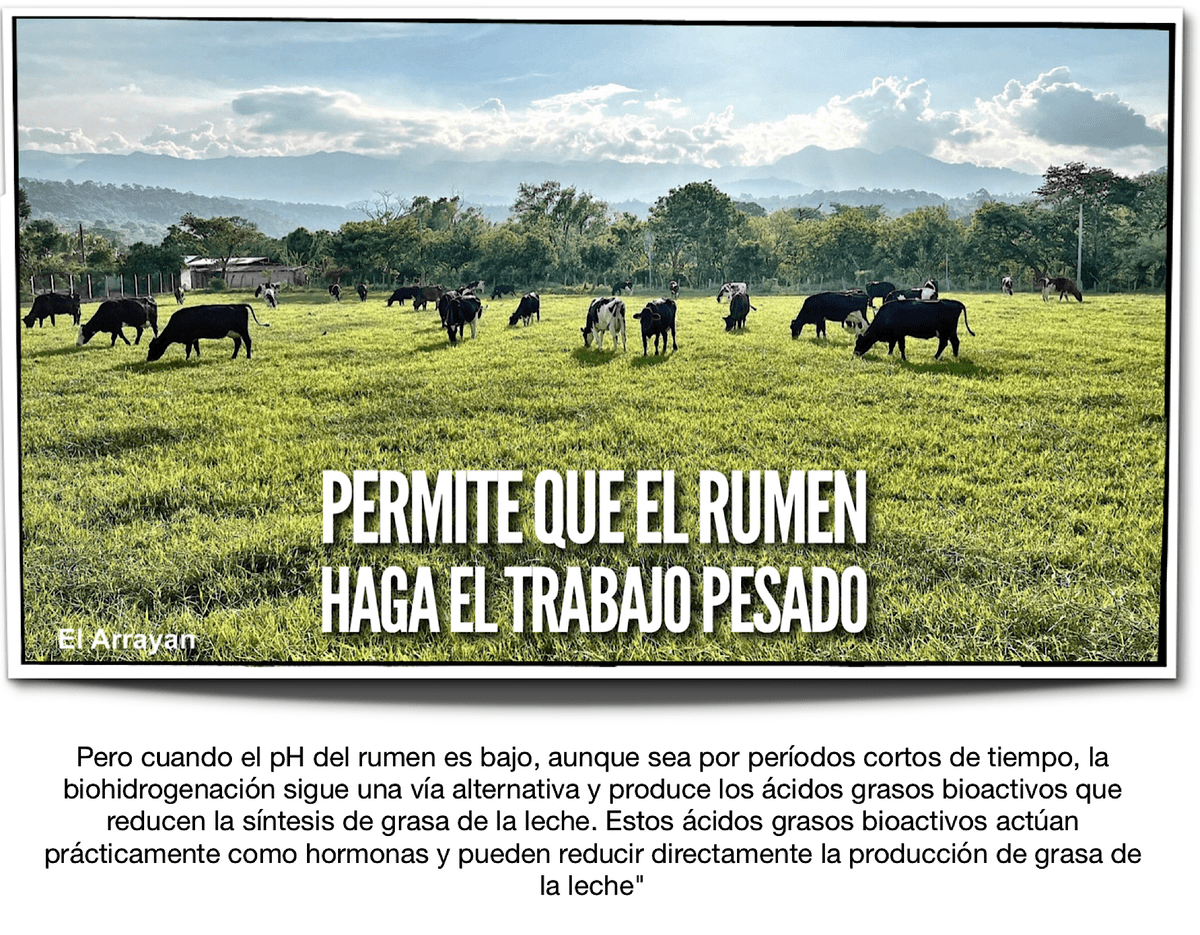 «Un pH más bajo en el rumen es indeseable, porque fomenta que los ácidos grasos se sometan a una biohidrogenación alternativa», añadió. «La biohidrogenación, el proceso mediante el cual los microbios del rumen convierten los ácidos grasos insaturados en ácidos grasos saturados, es un proceso normal en el rumen. Pero cuando el pH del rumen es bajo, aunque sea por períodos cortos de tiempo, la biohidrogenación sigue una vía alternativa y produce los ácidos grasos bioactivos que reducen la síntesis de grasa de la leche. Estos ácidos grasos bioactivos actúan prácticamente como hormonas y pueden reducir directamente la producción de grasa de la leche».