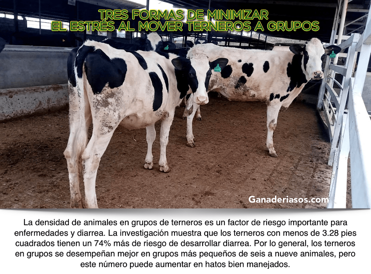 - La densidad de animales en grupos de terneros es un factor de riesgo importante para enfermedades y diarrea. La investigación muestra que los terneros con menos de 3.28 pies cuadrados tienen un 74% más de riesgo de desarrollar diarrea. Por lo general, los terneros en grupos se desempeñan mejor en grupos más pequeños de seis a nueve animales, pero este número puede aumentar en hatos bien manejados.