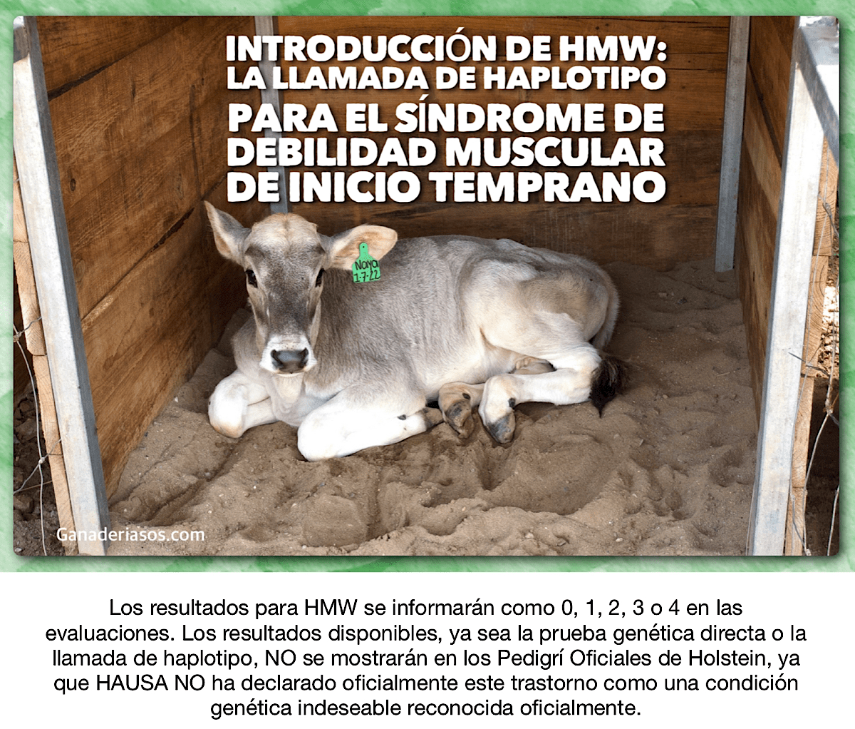 Abreviado como HMW, las evaluaciones genéticas de EE. UU. incluirán la notificación del estado de no portador (0), portador (1), homocigoto (2), portador probable (3) u homocigoto probable (4) de un animal para el síndrome de debilidad muscular de inicio temprano (abreviado MW).