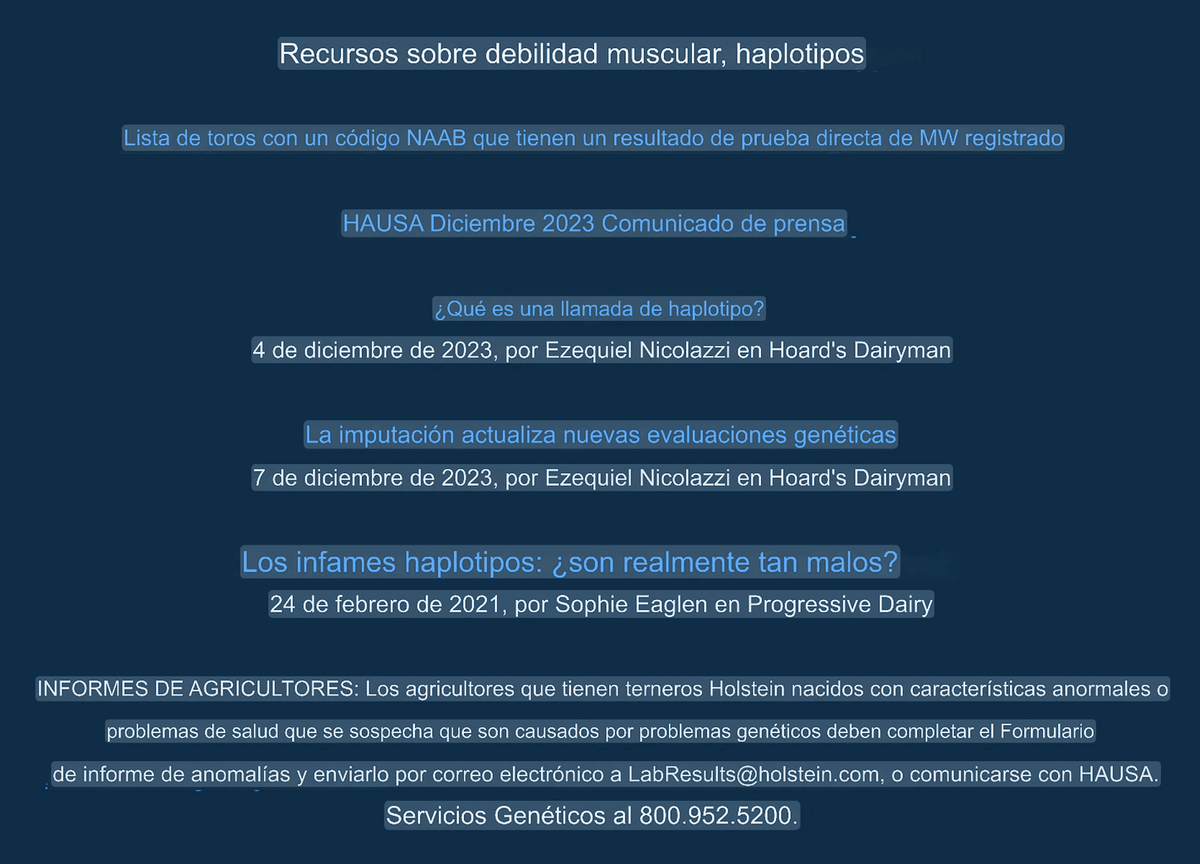 La Asociación Holstein USA (HAUSA) ha declarado el Síndrome de Debilidad Muscular de Inicio Temprano (MW) como una condición genética oficialmente reconocida, a partir de febrero de 2024. Esta decisión cuenta con el respaldo de la Junta Directiva de HAUSA, el Comité de Avance Genético, el personal, los criadores de Holstein e investigadores científicos. Las llamadas de haplotipo para MW fueron lanzadas por primera vez por CDCB en las evaluaciones genéticas de diciembre de 2023 y HAUSA seguirá utilizando los resultados de las pruebas de MW recibidas, que se comparten con CDCB para este esfuerzo colaborativo.