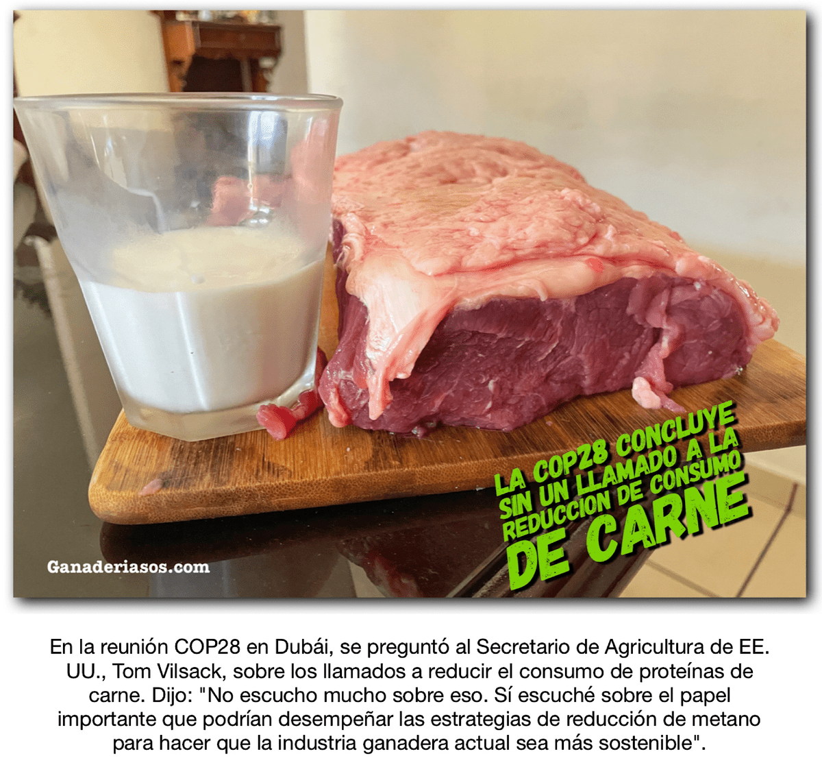 En la reunión COP28 en Dubái, se preguntó al Secretario de Agricultura de EE. UU., Tom Vilsack, sobre los llamados a reducir el consumo de proteínas de carne. Dijo: «No escucho mucho sobre eso. Sí escuché sobre el papel importante que podrían desempeñar las estrategias de reducción de metano para hacer que la industria ganadera actual sea más sostenible».