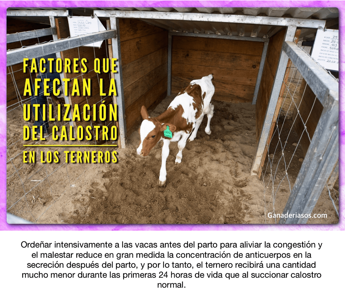 Ordeñar intensivamente a las vacas antes del parto para aliviar la congestión y el malestar reduce en gran medida la concentración de anticuerpos en la secreción después del parto, y por lo tanto, el ternero recibirá una cantidad mucho menor durante las primeras 24 horas de vida que al succionar calostro normal. Por ejemplo, la concentración de Ig en la secreción posparto durante las primeras 24 horas después del parto puede ser solo de 1,6 g/litro en lugar de un valor de aproximadamente 68 g/litro. Por lo tanto, la secreción producida después del parto por vacas que han sido ordeñadas intensivamente antes del parto tiene menos valor para el ternero que el mismo volumen de calostro normal.»
