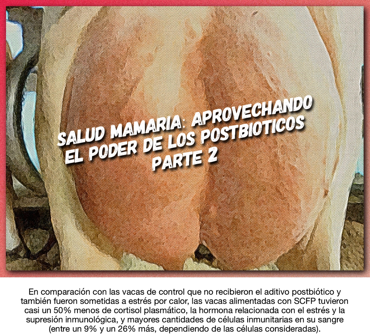 La investigación ha demostrado los beneficios directos de alimentar a las vacas lecheras con un aditivo alimenticio postbiótico para su salud mamaria. Resultados prometedores sobre los efectos positivos en la salud mamaria (por ejemplo, reducción de la incidencia de mastitis y puntuaciones de células somáticas) de los aditivos alimenticios postbióticos, específicamente un producto de fermentación de Saccharomyces cerevisiae (SCFP) disponible comercialmente, estaban surgiendo de su uso en el campo y fueron reportados oficialmente por primera vez por el Dr. Jim Ferguson (Escuela de Medicina Veterinaria de la Universidad de Pensilvania) en 2018. Observó una reducción tanto en la incidencia de mastitis como en las puntuaciones mensuales de células somáticas DHI en las lecherías que utilizaron el producto durante un año completo en los EE. UU. en comparación con su año anterior de operación.