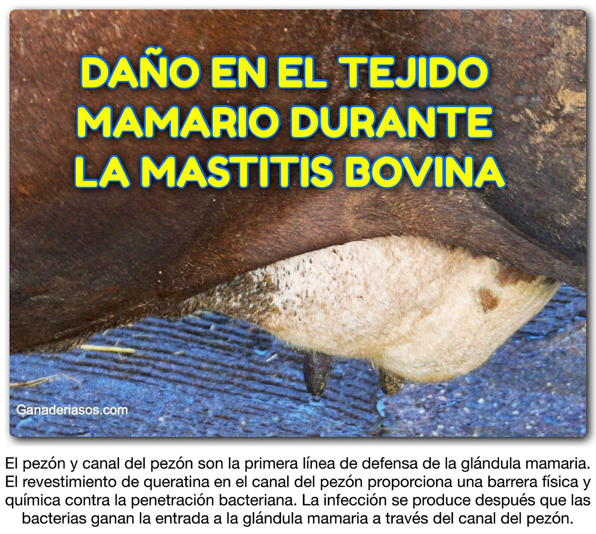 El pezón y canal del pezón son la primera línea de defensa de la glándula mamaria. El revestimiento de queratina en el canal del pezón proporciona una barrera física y química contra la penetración bacteriana. La infección se produce después que las bacterias ganan la entrada a la glándula mamaria a través del canal del pezón. Éstas pueden escapar de los mecanismos de defensa naturales por multiplicación a lo largo del canal del pezón, especialmente después del ordeño; o por propulsión en la cisterna del pezón por las fluctuaciones de vacío en la punta del pezón durante el ordeño. Superada la defensa anatómica, las bacterias deben evadir los mecanismos de defensa celular y humoral de la glándula para establecer la enfermedad. Si la infección no se controla, los niveles de bacterias en la glándula mamaria finalmente se elevan a un nivel en el cual comienza a producirse daño en el epitelio mamario.