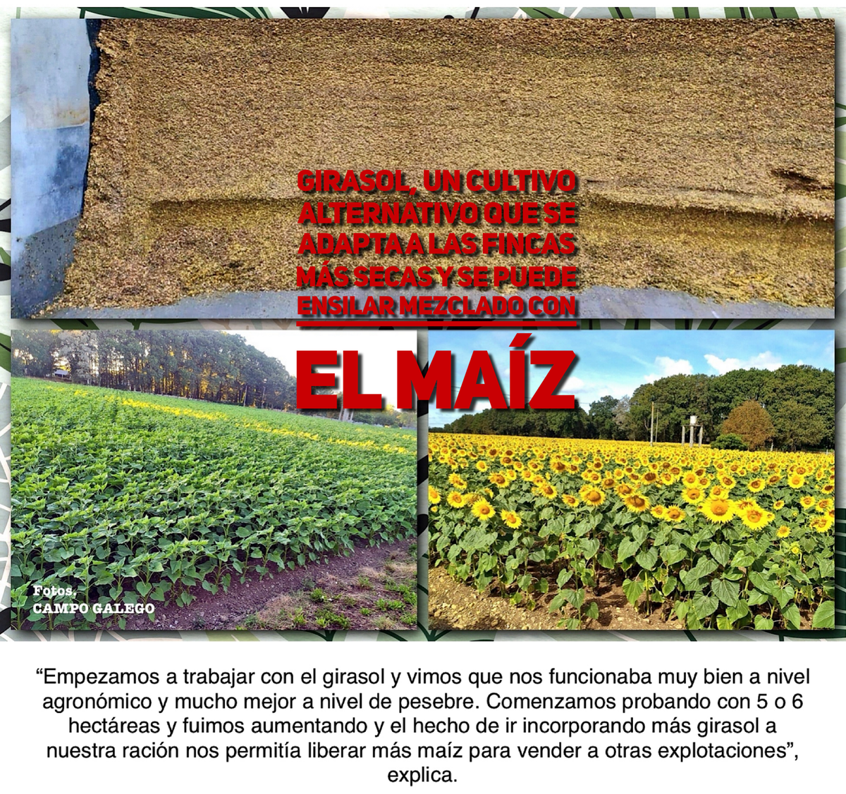 Pero a pesar de estas limitaciones, en Galicia existen experiencias limitadas en cultivos forrajeros de verano alternativos al maíz, como pueden ser el sorgo, el pasto de Sudán o el girasol, empleado en algunos casos para sembrar en los perímetros de las fincas para minimizar los ataques del jabalí, pero en pocas ocasiones como cultivo principal único en la parcela.