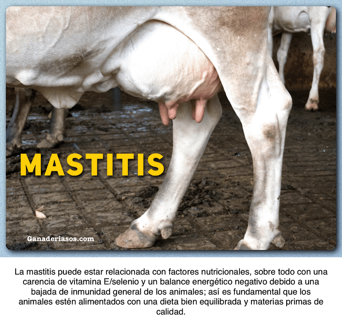 La mastitis puede estar relacionada con factores nutricionales, sobre todo con una carencia de vitamina E/selenio y un balance energético negativo debido a una bajada de inmunidad general de los animales; así es fundamental que los animales estén alimentados con una dieta bien equilibrada y materias primas de calidad. La rutina del ordeño y la higiene que se mantiene durante y entre ordeños son también puntos críticos.